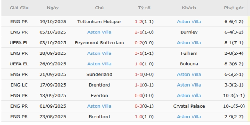 Thành tích gần đây của Aston Villa